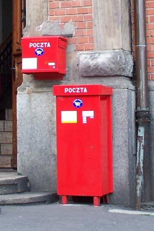 Skrzynki pocztowe przed jednym z wej¶æ do mys³owickiej poczty (fot. m-ce.pl)